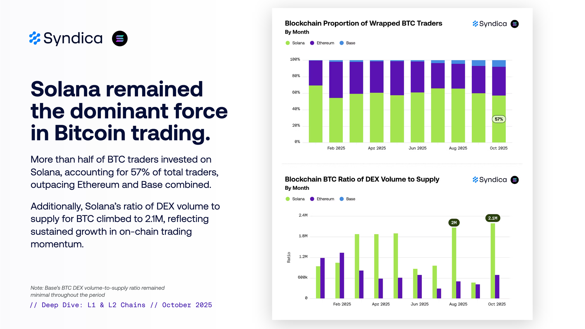 Solana remained the dominant force in Bitcoin trading. More than half of BTC traders invested on Solana, accounting for 57% of total traders, outpacing Ethereum and Base combined.