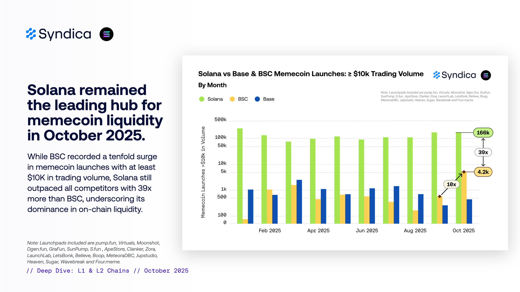Solana remained the leading hub for memecoin liquidity in October 2025. While BSC recorded a tenfold surge in memecoin launches with at least $10K in trading volume, Solana still outpaced all competitors with 39x more than BSC, underscoring its dominance in on-chain liquidity.