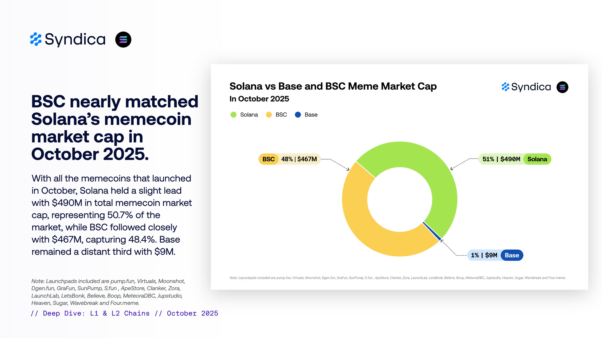 BSC nearly matched Solana’s memecoin market cap in October 2025. With all the memecoins that launched in October, Solana held a slight lead with $490M in total memecoin market cap, representing 50.7% of the market, while BSC followed closely with $467M, capturing 48.4%. Base remained a distant third with $9M.