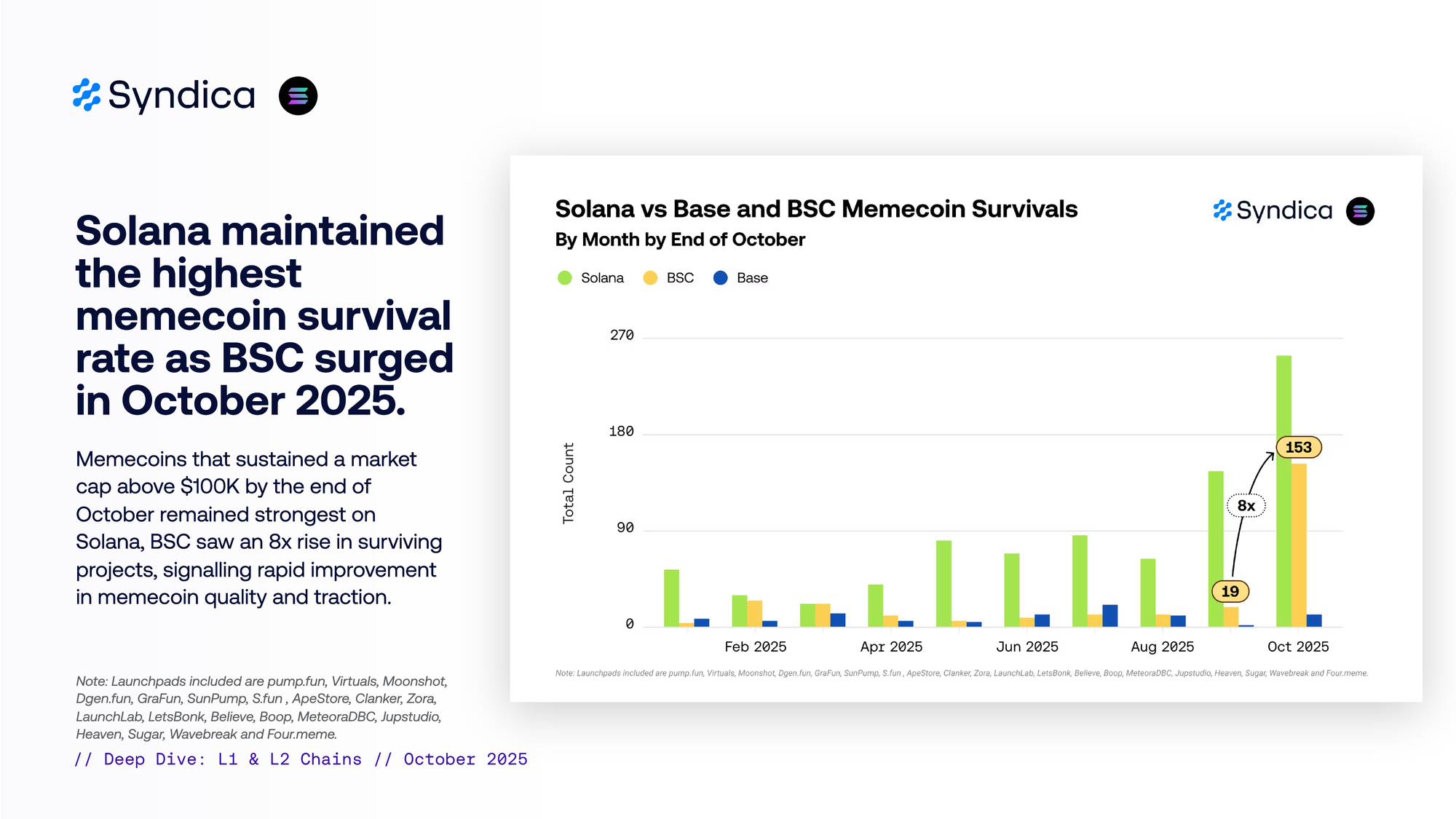 Solana maintained the highest memecoin survival rate as BSC surged in October 2025. Memecoins that sustained a market cap above $100K by the end of October remained strongest on Solana, BSC saw an 8x rise in surviving projects, signaling rapid improvement in memecoin quality and traction.