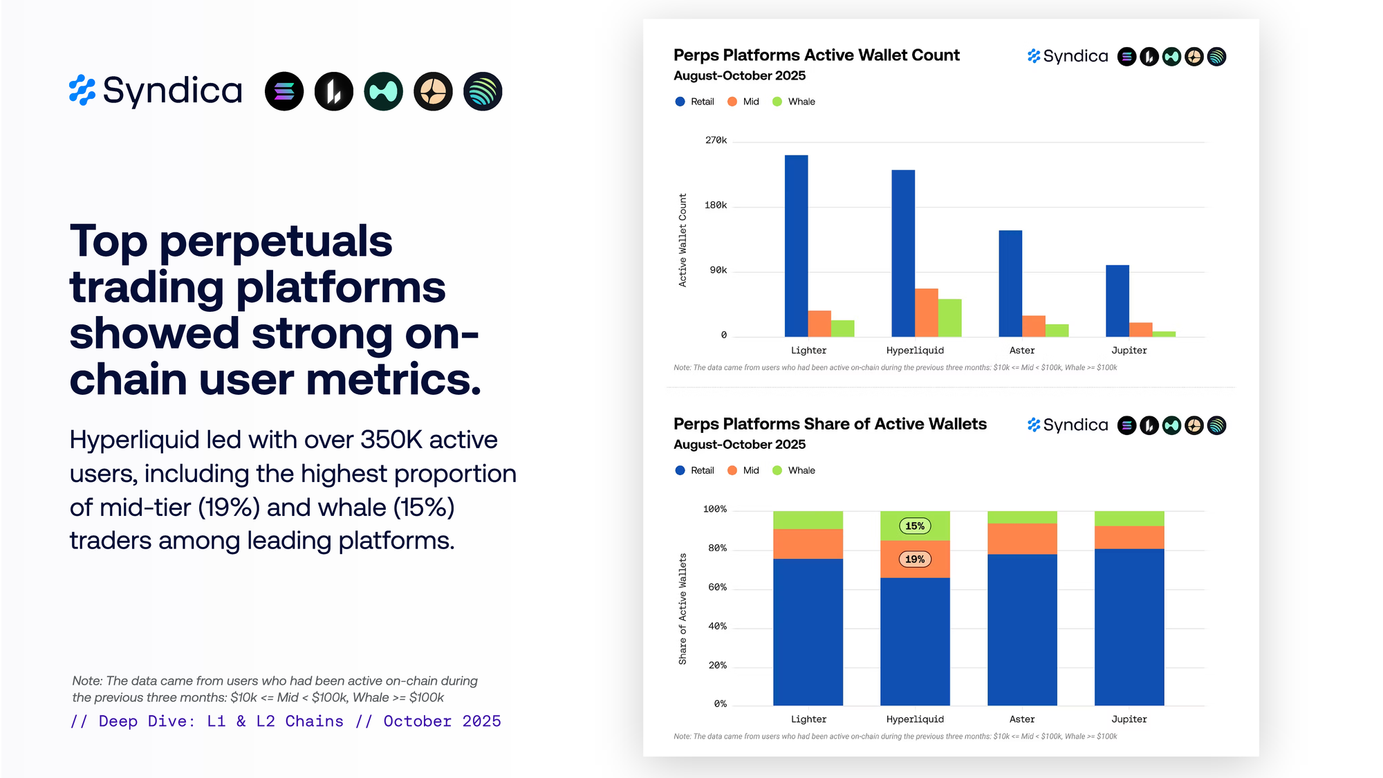 Top perpetuals trading platforms showed strong on-chain user metrics. Hyperliquid led with over 350K active users, including the highest proportion of mid-tier (19%) and whale (15%) traders among leading platforms.