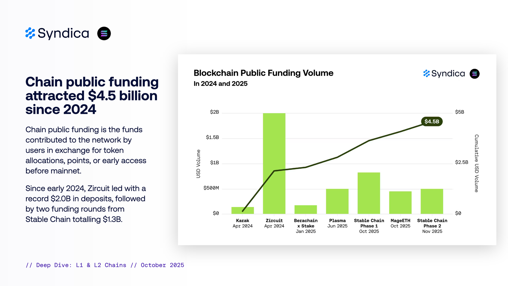 Chain public funding attracted $4.5 billion since 2024. Chain public funding is the funds contributed to the network by users in exchange for token allocations, points, or early access before mainnet. Since early 2024, Zircuit led with a record $2.0B in deposits, followed by two funding rounds from Stable Chain totalling $1.3B.