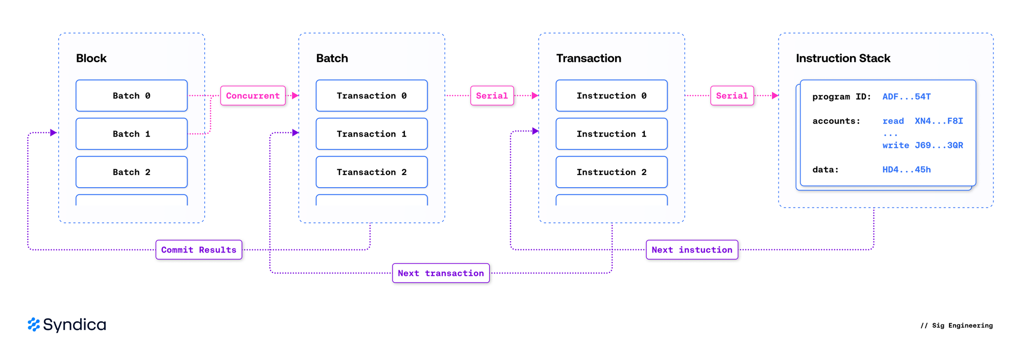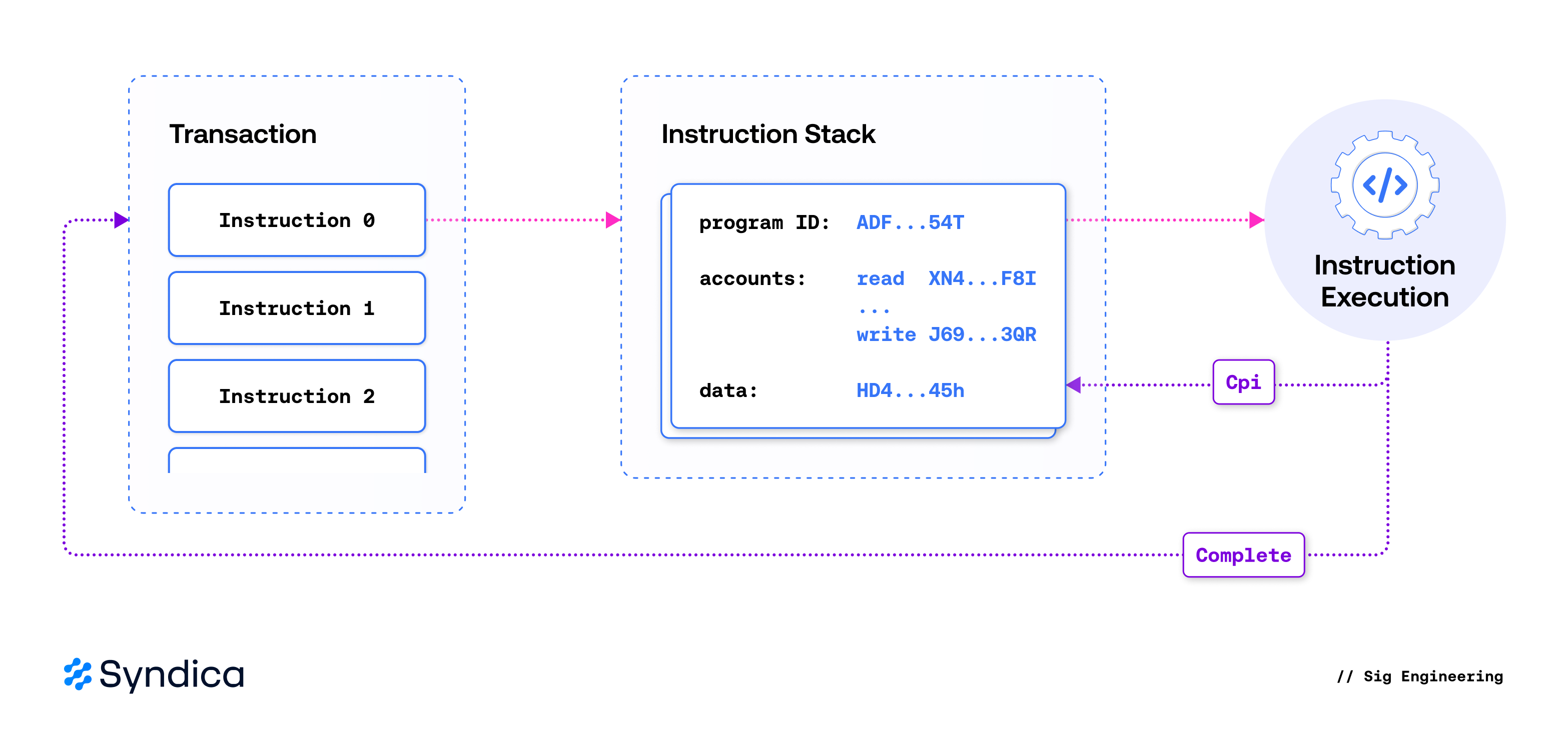 Essential to CPI is the instruction stack—a structure that tracks the currently executing program, allowing CPI calls to return the results to their calling context. An instruction specified within a transaction begins its execution by being pushed onto an empty stack. Afterward, the instruction processor reads it from the stack and invokes its target program. When a CPI occurs, a new instruction is pushed onto the stack; the instruction processor recognizes this and immediately begins executing the new instruction. Once a program runs to completion, its result is recorded, and its associated instruction is popped off the stack.